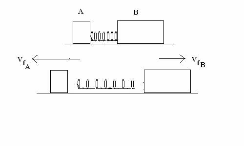 1. (40 points)  A block of mass m and a block of mass 3m are used to sandwich a mass-less spring with force constant k. In the diagram below mA = m and mB = 3m. The blocks are not connected to the spring and the spring drops to the surface after it has expanded. Initially the blocks are at rest on a frictionless surface and they are being held together so that the spring between them is compressed by an amount D from its equilibrium length. The blocks are then released, and the spring pushes them off in opposite directions. Shown below are the   final velocity components along the x-axis after the expansion. The following answers must each be expressed in terms of  symbols k, m and D.