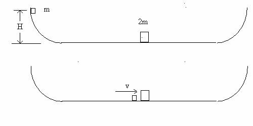 2. (40 points )  At t = 0, two masses  are shown at rest on a frictionless track that has two curved portions at either end and a central straight, horizontal section at the bottom.  The block of mass m is at the  top of the curved section and  slides down the track toward the right. It collides with a block of mass 2m  located  on the straight part of the track. The collision is elastic. The initial height H = 2.00 meters  and m = 1.00 kg.