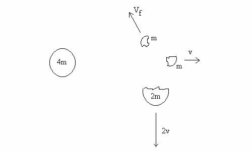 3.  (40 points)  You are on a Star Trek mission and observing an asteroid explode on your computer screen.  The asteroid of mass 4m is in deep space and  initially at rest. Then it bursts into three pieces. One chunk, of mass m, moves horizontally to the right with speed v. Another chunk , of mass 2m, moves in a direction downward at 90 degrees to the direction of the first piece.
