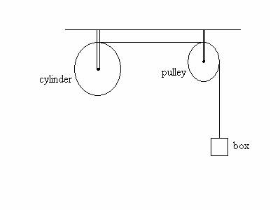 4 (40  points) The cylinder and pulley turn without friction about stationary horizontal axles that pass through their  centers. A light rope is wrapped around the cylinder, passes over the pulley, and has a 3.00 kg box suspended from its free end. There is no slippage between the rope and pulley or cylinder surface. The uniform cylinder has mass 5.00 kg and radius 40.0 cm.  The pulley is also a uniform cylinder with mass 2.00 kg  and radius 20.0 cm. The box is released from rest and descends as the rope unwraps from the cylinder .
