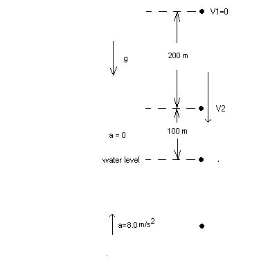 2. (20 points) A rescue package is dropped from a hovering helicopter with initial speed zero and falls downward for a distance of 200 m. After falling the 200 m, it reaches a velocity V2 when a timed parachute opens and the acceleration becomes zero. It falls a distance H = 100 m with this zero acceleration. Then it hits the surface of a lake and decelerates (slows down) with an acceleration of magnitude 8.0 m/s2 . As you can see, the acceleration points up while it is in the water.